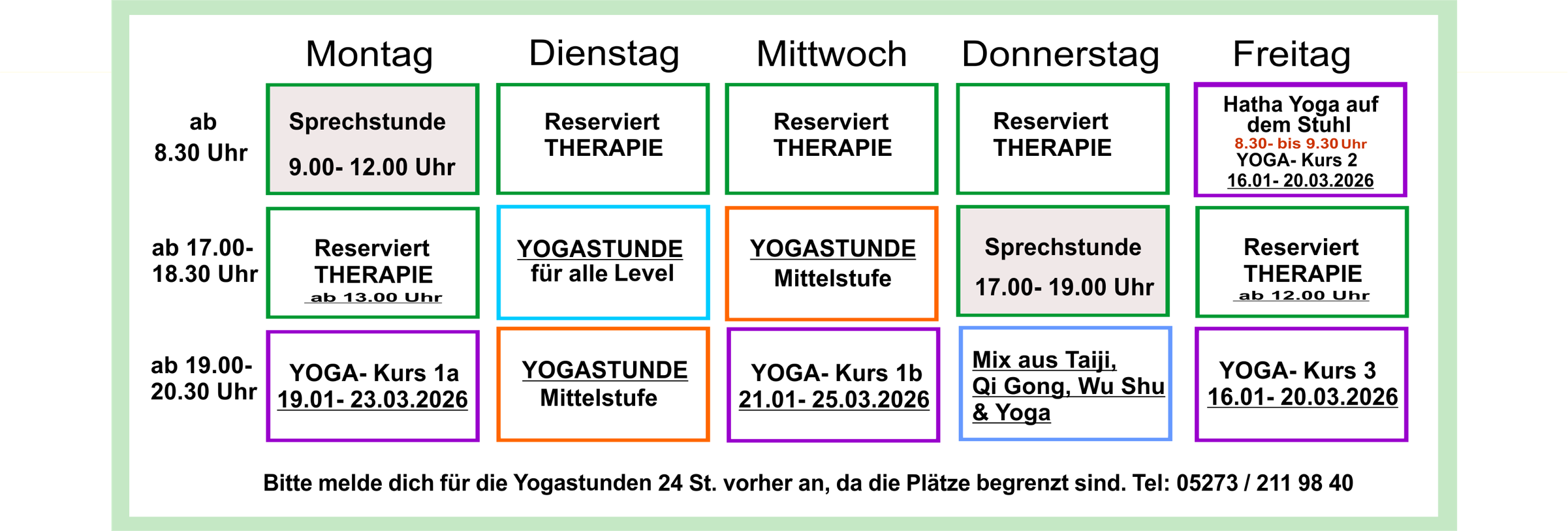 Regelmäßige offene Yogastunden, Teilnahme mit unseren günstigem Fünfer-/ Zehnerkarten System.